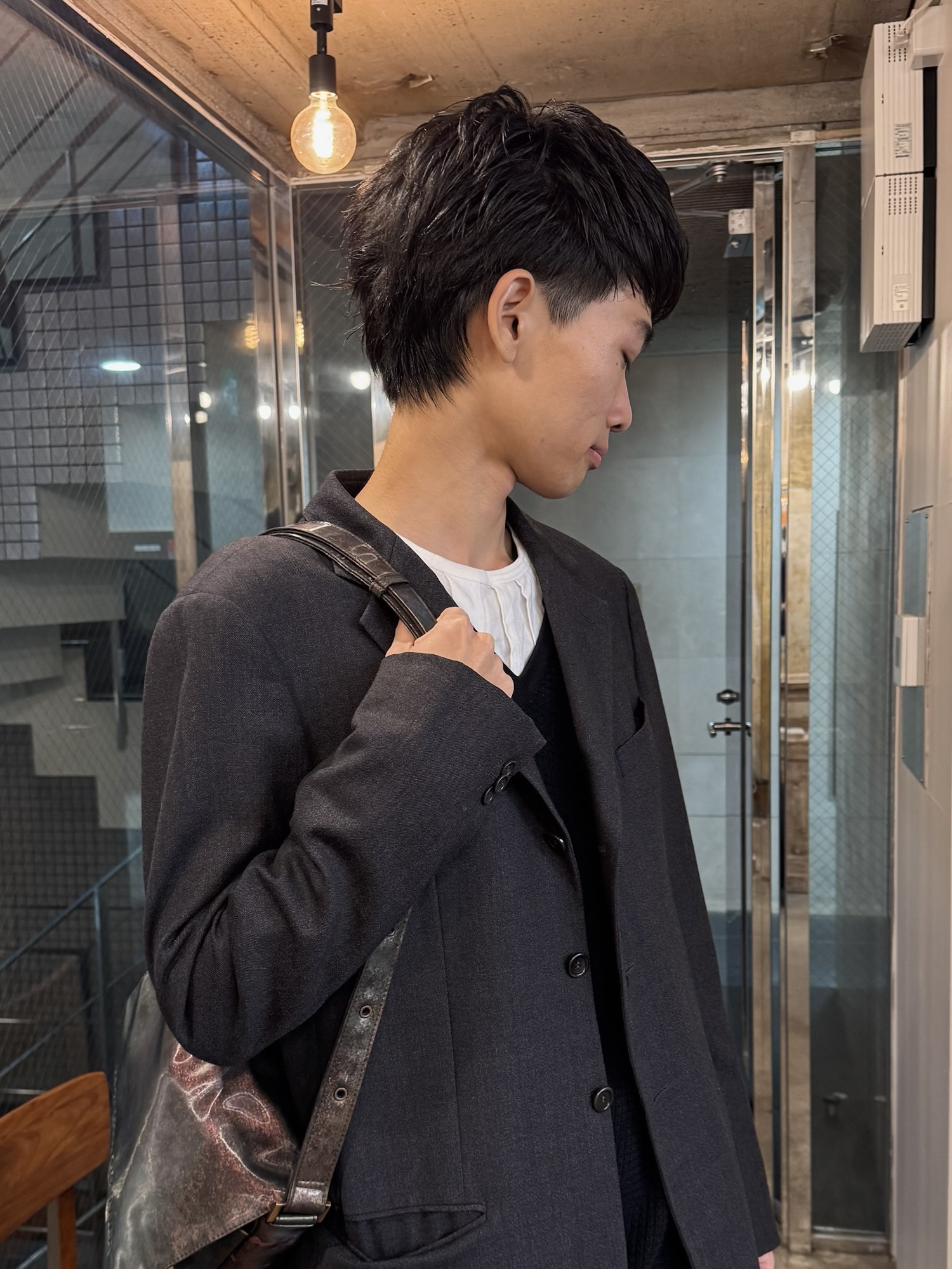前は短く、襟足を長く残す個性的なシルエットのミディアムスタイルです。モードにもカジュアルにも振れる万能さが魅力で、周りと差をつけたい方におすすめです。
